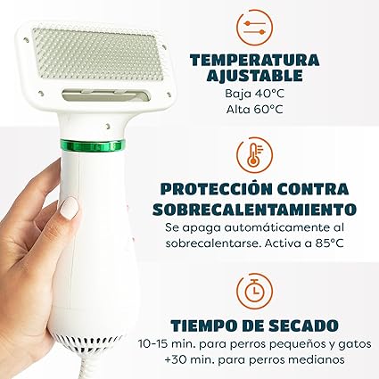 ✨ Tecnología silenciosa anti-estrés ✨ Dos temperaturas suaves y seguras ✨ Cerdas suaves que desenredan sin dolor ✨ Diseño ergonómico, ligero y fácil de usar con una sola mano ✨ Ideal para después del baño o paseos en días lluviosos